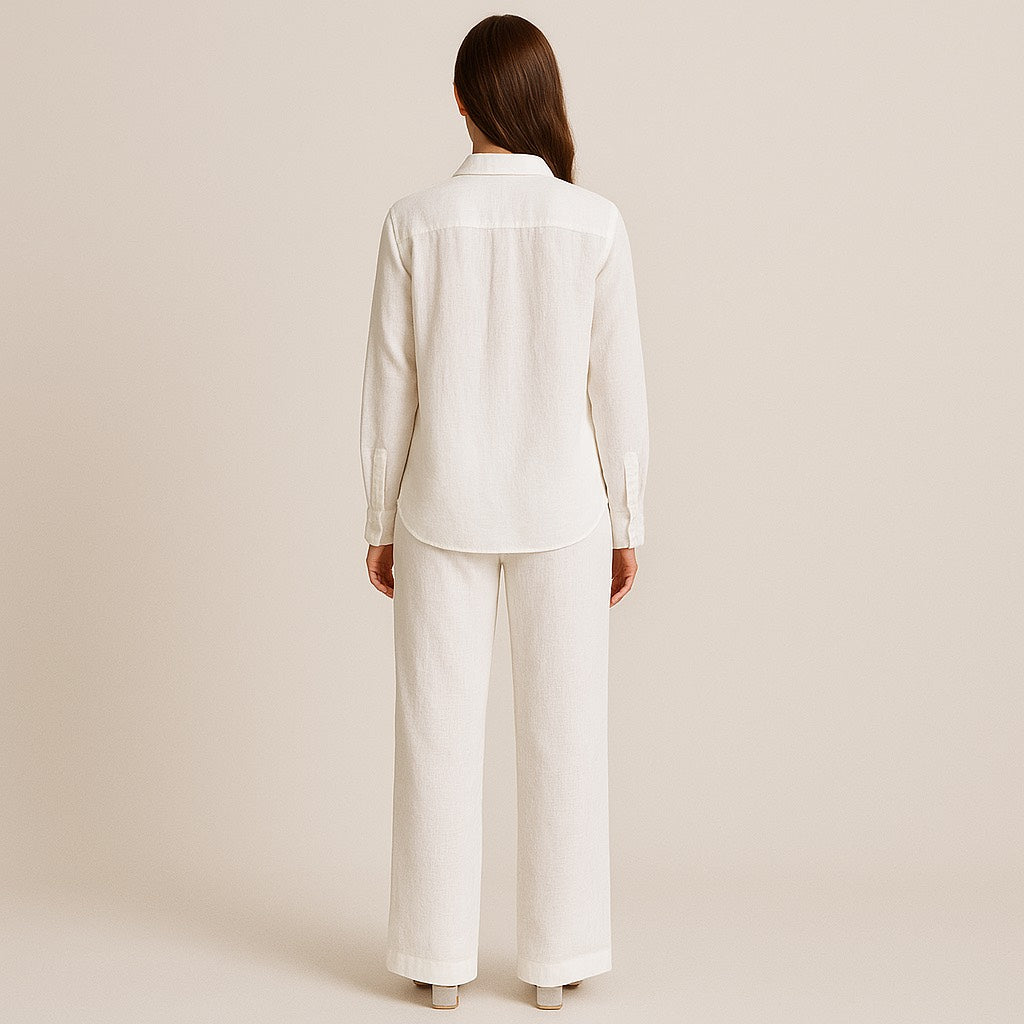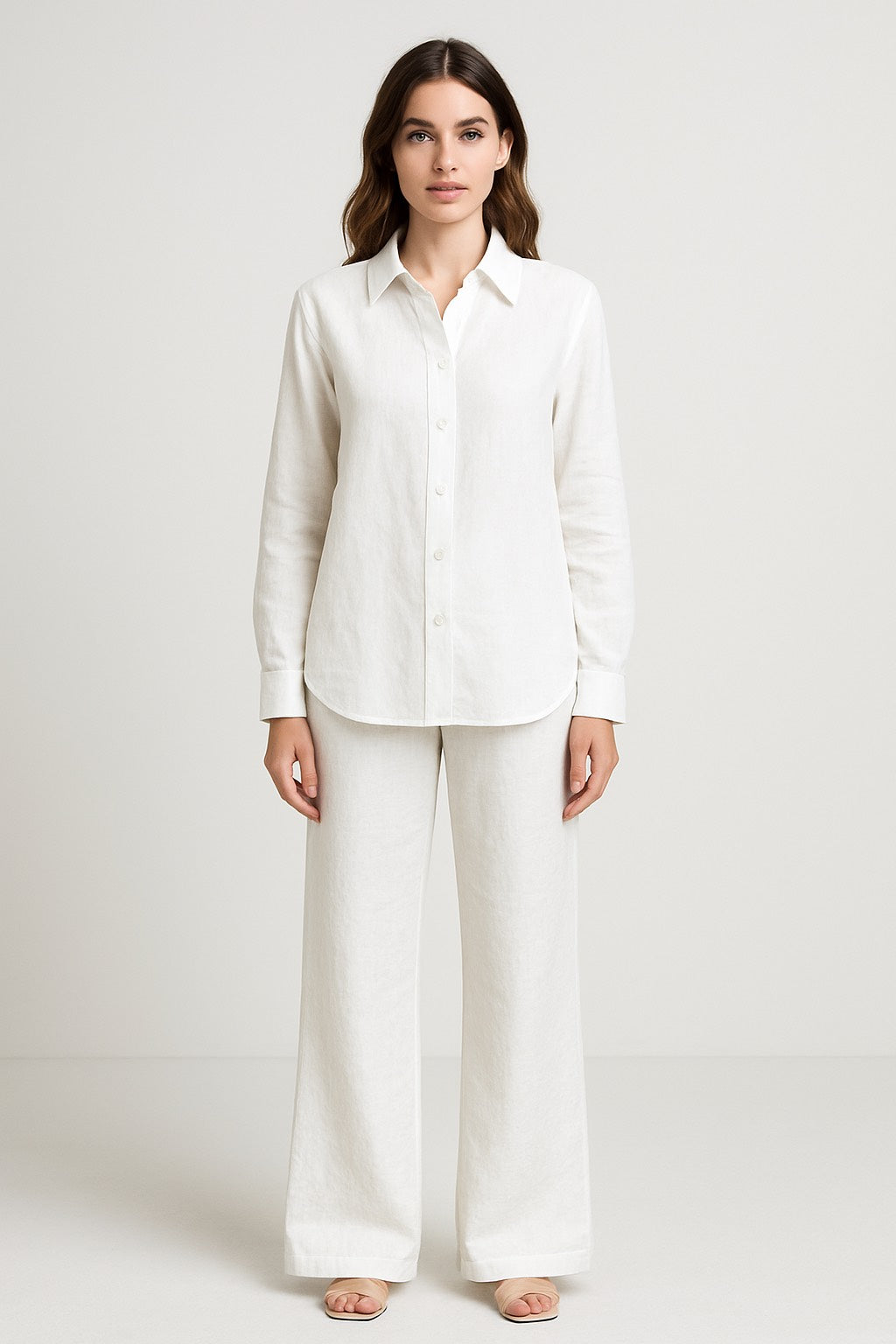 A refined two-piece linen co-ord set featuring a button-down shirt with full sleeves and straight-fit trousers. Lightweight, breathable, and effortlessly chic, perfect for all-day comfort and style.
