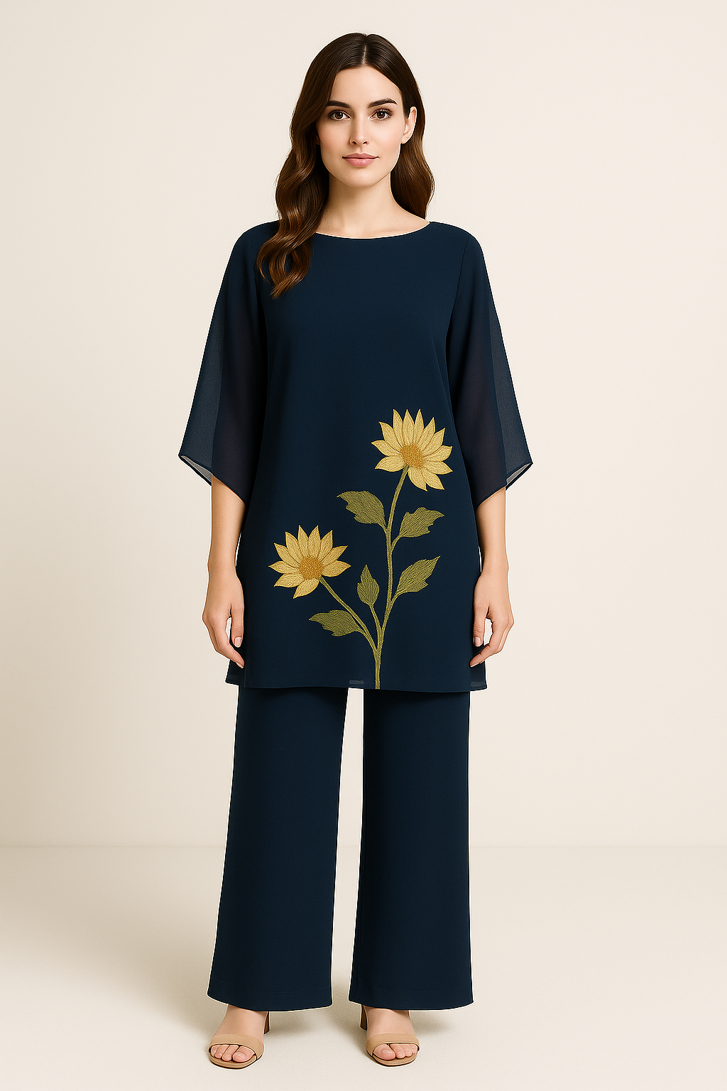An elegant navy co-ord set featuring a flowy top with slit sleeves and large floral prints, paired with matching wide-leg trousers. A chic blend of comfort and statement style.